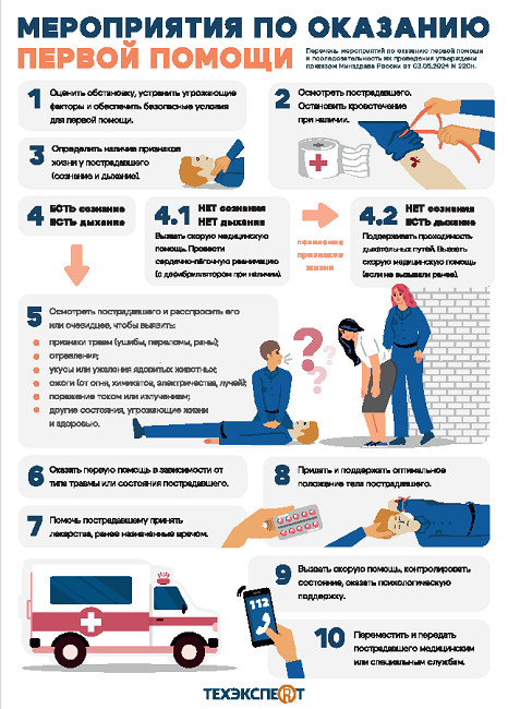 Уважаемые пользователи системы "Техэксперт: Охрана труда"! Мы рады представить вам новый информационный плакат "Мероприятия по оказанию первой помощи". Этот плакат разработан с целью повышения готовности и грамотности персонала к оперативному и правильному реагированию в чрезвычайных ситуациях.